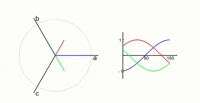 Our goal is to get a smoothly rotating magnetic field like this to be created by only changing the currents flowing though the 3 windings.
